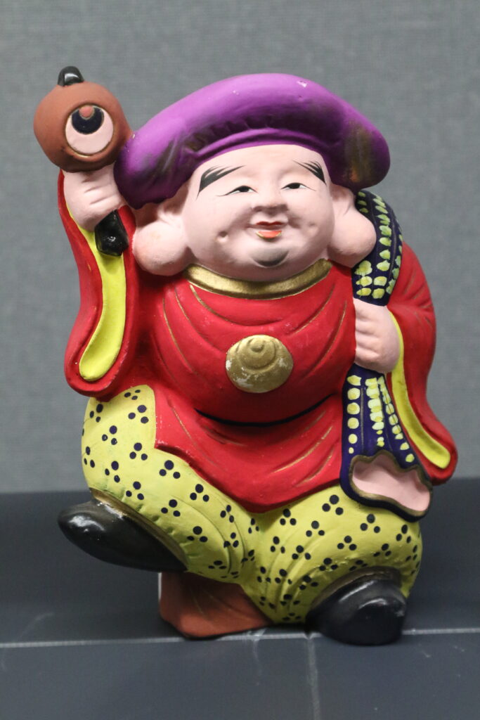 土人形としての大黒天は、正月飾りや縁起物として広く親しまれ、家の台所や商家の店先に置かれることも多くありました。本作もまた、日常の中で福を願う人々の思いを映した一体といえるでしょう。