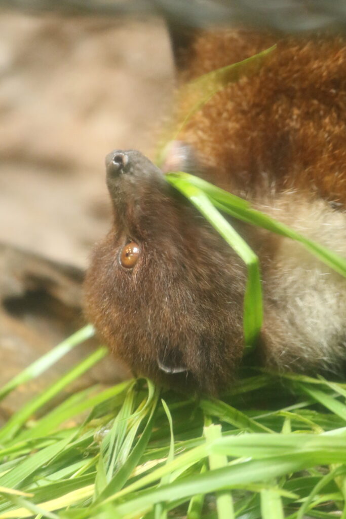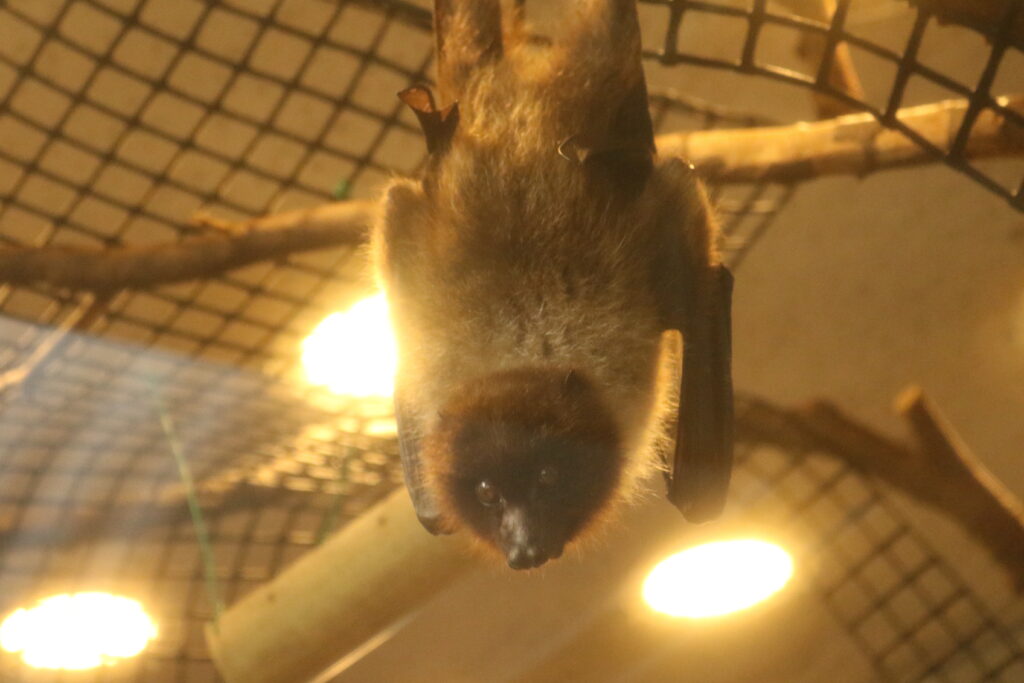 通常のコウモリは超音波を出して飛行する夜行性ですが、このオオコオモリの仲間は昼行性で、超音波ではなく視覚に頼って生活しています。