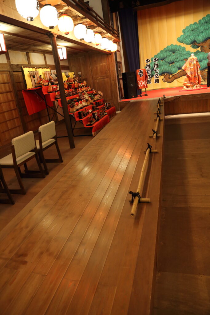 この通路は花道と呼ばれ、役者さんが出入りする部分で、とても趣があります。
