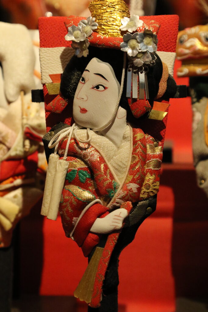 さまざまな意匠の羽子板が並ぶ展示。人物表現の違いが際立つ。