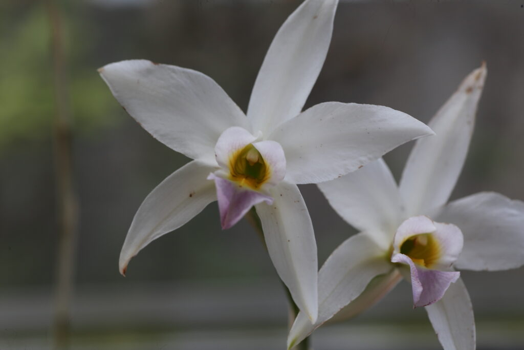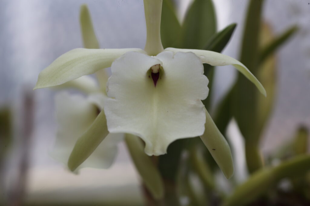 あわせて展示されていた Laelia anceps alba は、星形に広がる白い花弁と、紫と黄色の唇弁が印象的だった。