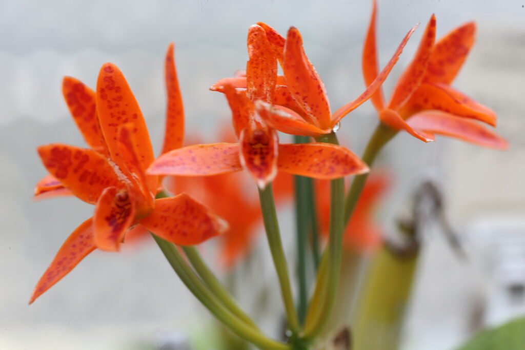 仮鱗茎は50cm近くに伸びており、細長い姿が目を引く。一方で花は小輪で、鮮やかな橙色をしている。