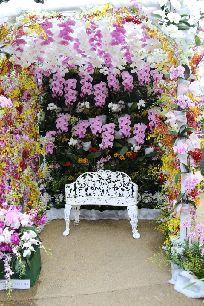 会場内には、蘭に囲まれたベンチ型の展示も設けられていた。
