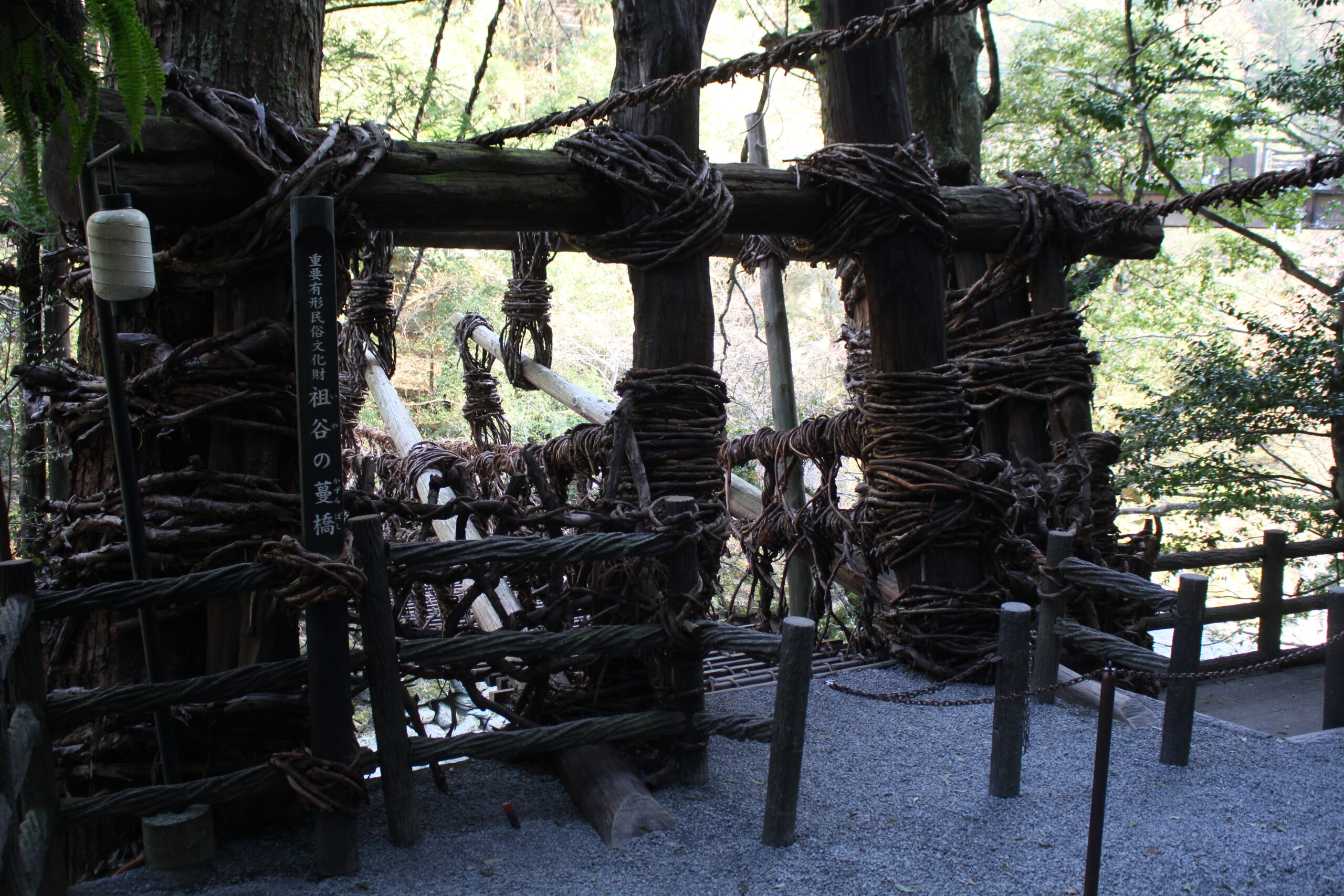 祖谷のかずら橋は、木と蔓で作られた吊り橋で、渡ると足元が見えてスリル満点。