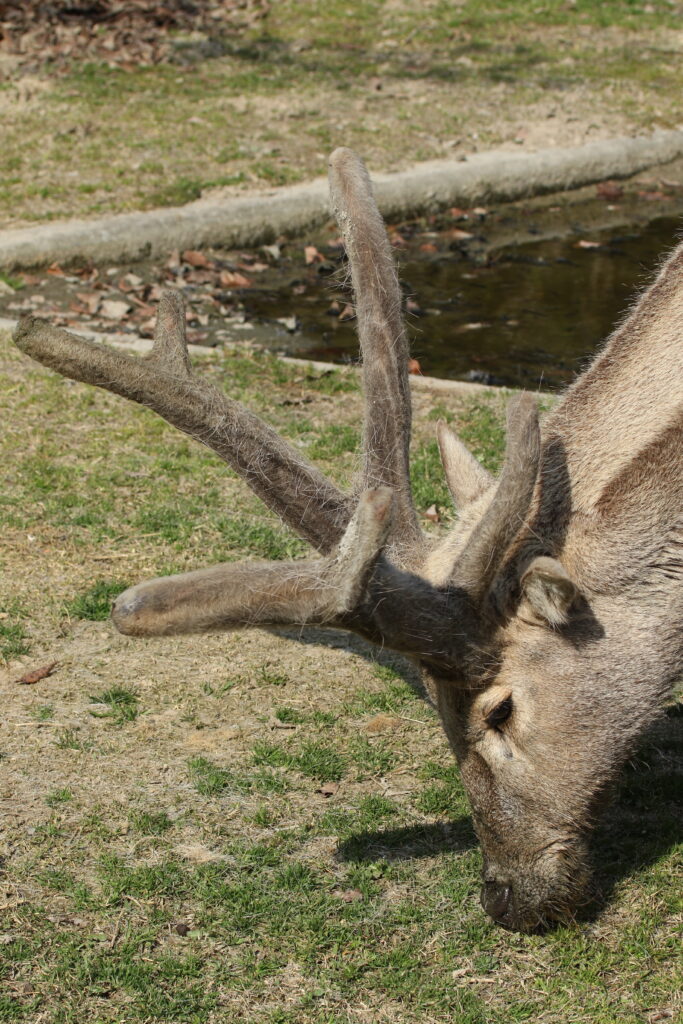 上の写真2枚を比べてもらうと、12月の抜ける前の固そうなツノと、6月ころ産毛のような柔らかそうなツノ(たぶん固い)の違いが判るかと思います。