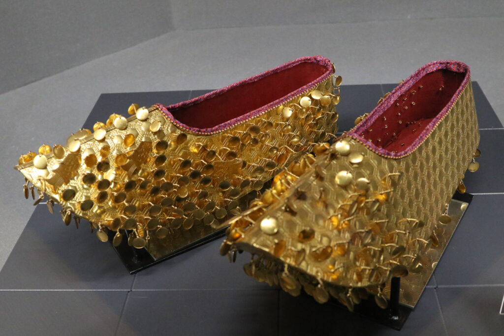 この金色の靴は、古墳時代の副葬品として作られた特別な履き物です。