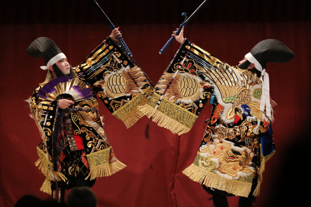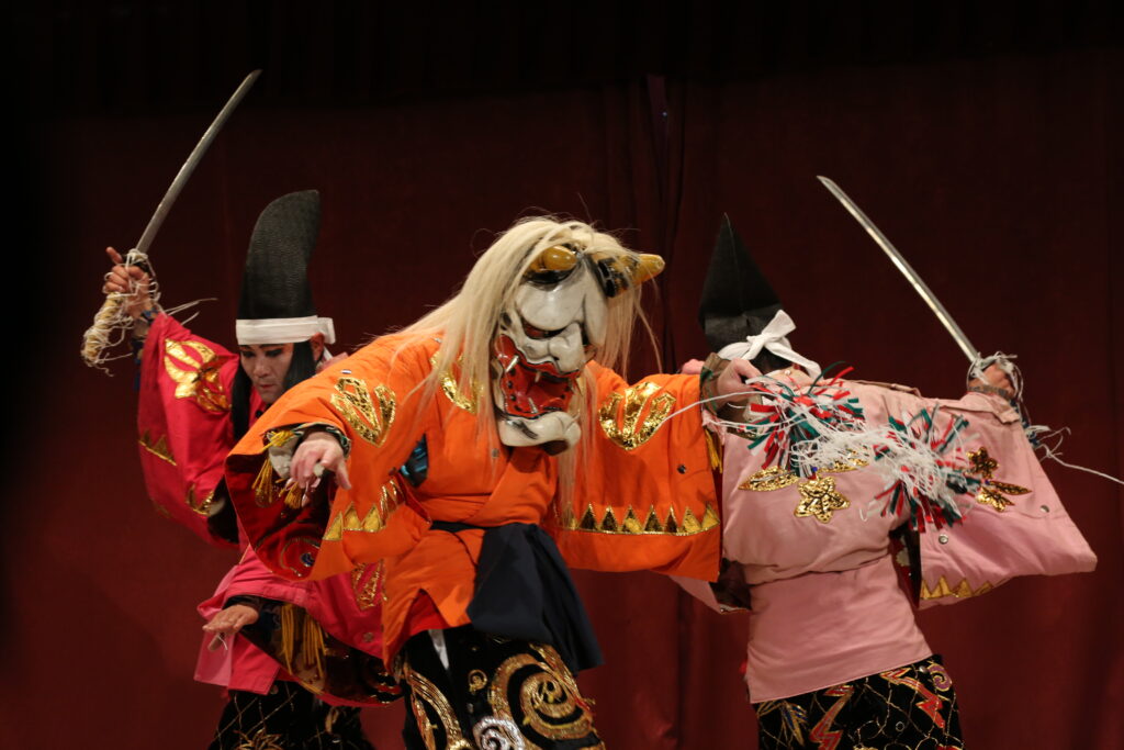装束には金糸や刺繍が施され、仮面や動きによって人ならざる存在が表現されます。