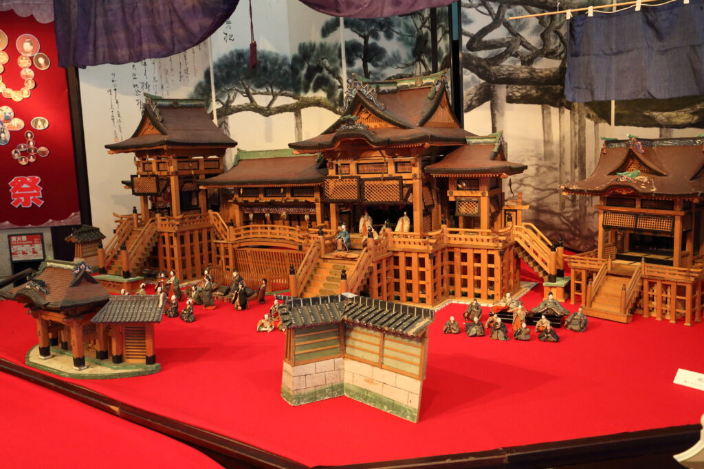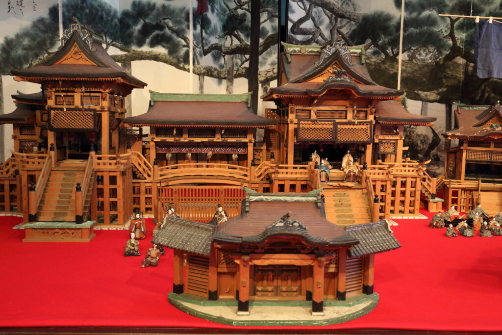 まず目を引くのが、巨大な建築模型のようなひな飾り。