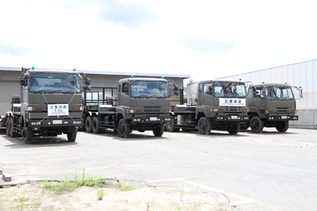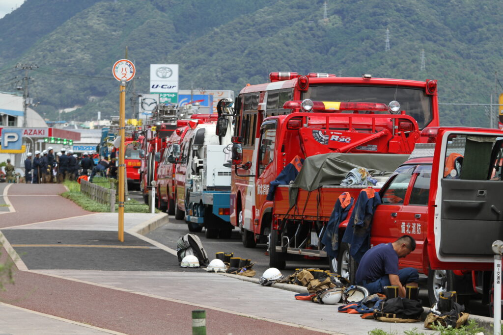 消防や自衛隊の車両が集まり、多くの隊員が作業を行っていました。