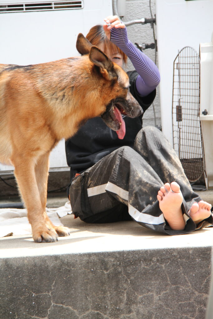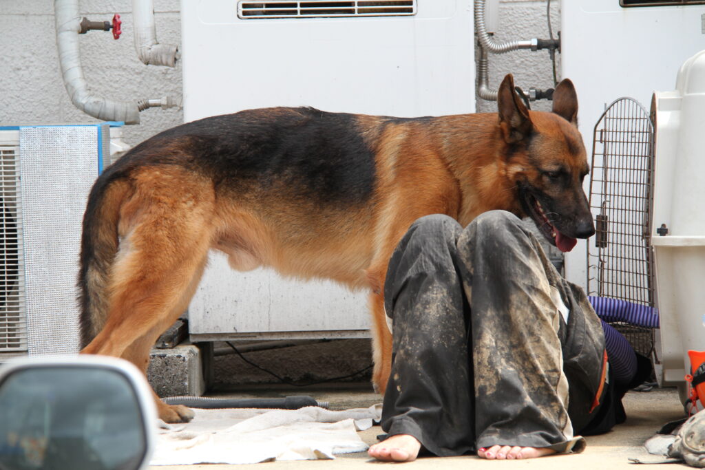 泥に覆われた現場で、救助隊と犬(ジャーマンシェパード)が協力して捜索を続ける姿はとても印象的でした。