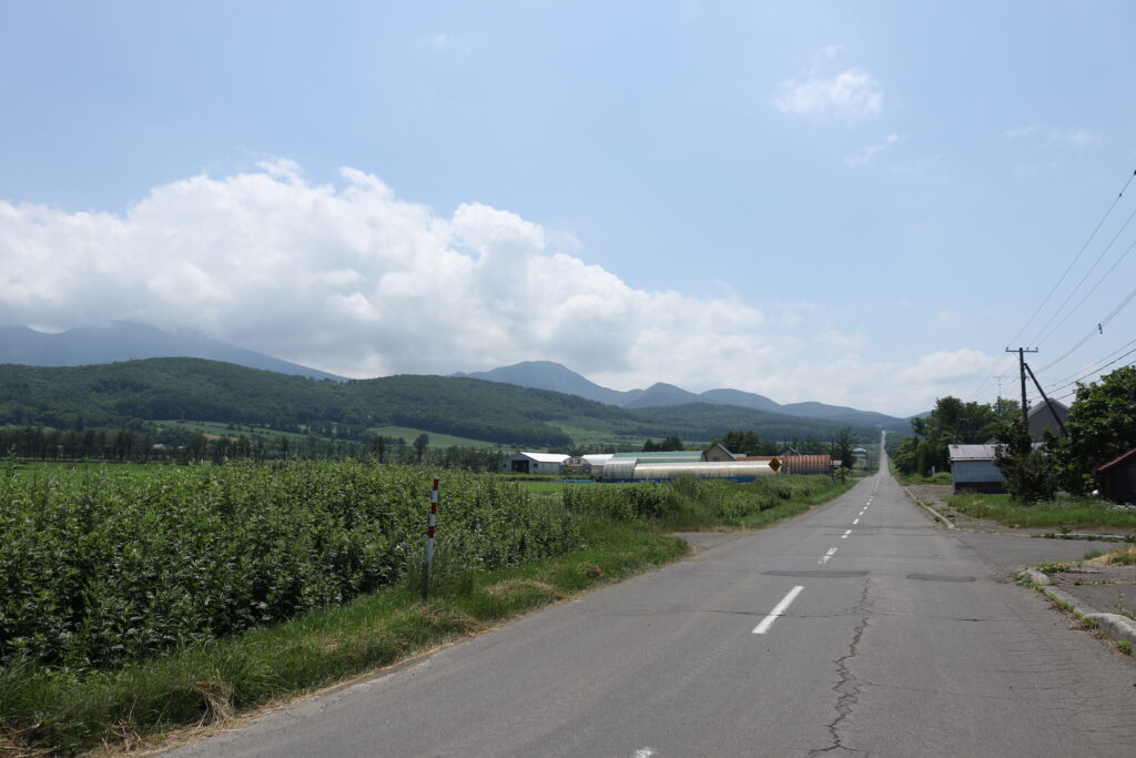 峠を下りると、まっすぐに伸びる道と畑、遠くの山並みが続く。