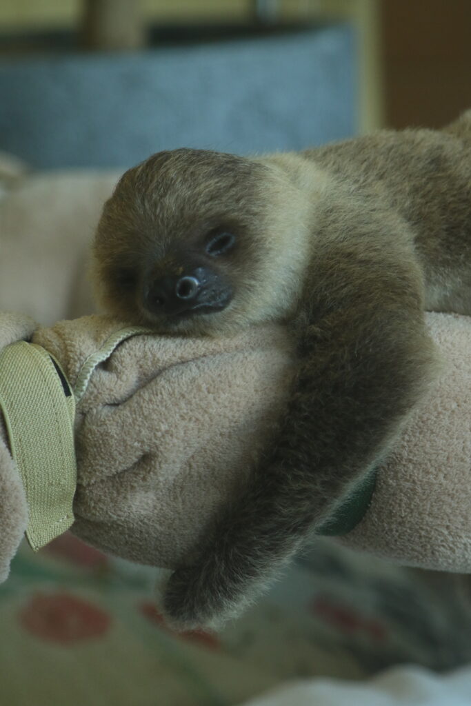 This young two-toed sloth has been carefully raised with great dedication by veterinarians and keepers.
