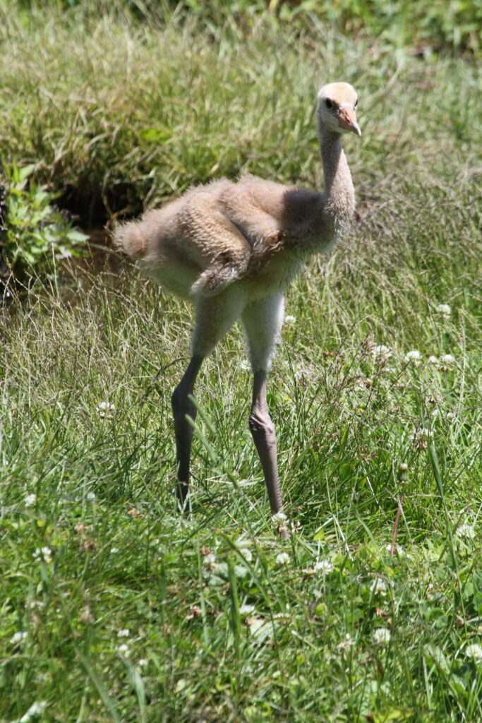 As the chick grows, its legs lengthen rapidly, giving an early glimpse of the elegant crane it will become.