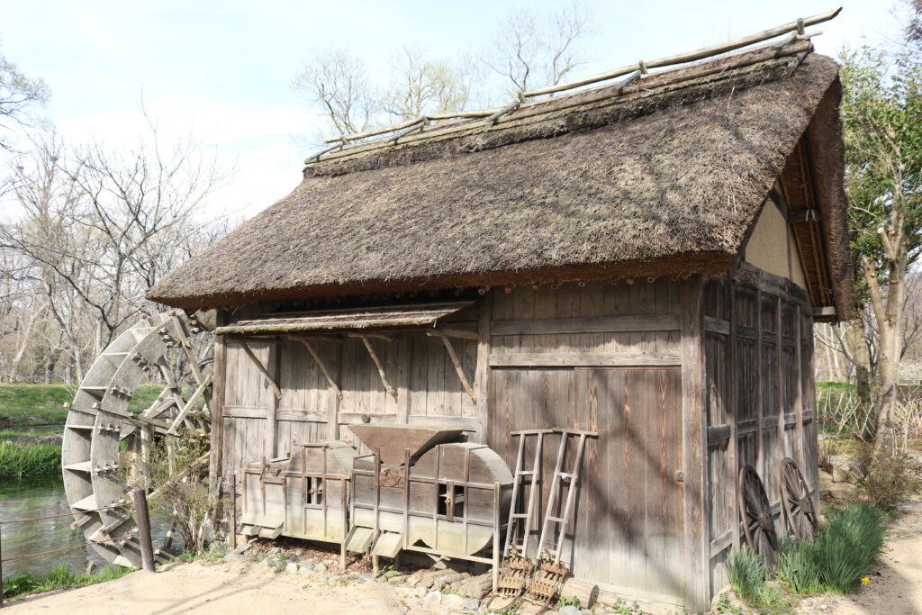 The old waterwheel and traditional buildings show